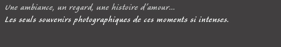 Je serai à l'affût des moments les plus complices et les plus intimes en jouant sur les regards, sur les lumières, sur l'ambiance. ( Voir la galerie ). C'est ma philosophie pour obtenir des clichés authentiques et artistiques propres à votre mariage.